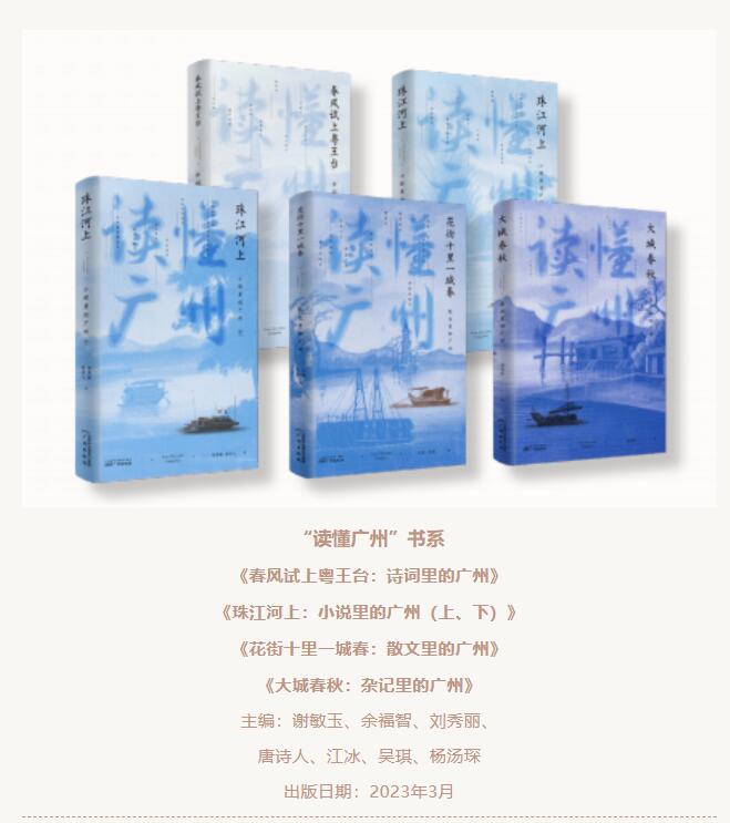 “读懂广州”书系精选书写广州的历史、文化、民生及发展的名家名作,按散文、小说、诗词、杂记4种体裁,分为5册。所选作品以广州为写作背景,反映广州的人文历史、民俗文化、生活习惯、社会经济等,带有鲜明的广州元素、城市印记和时代特征,充分反映广州社会、经济、民生等各层面的发展变化,向读者展现广州传统文化与现代文明互融互促的和谐之美。