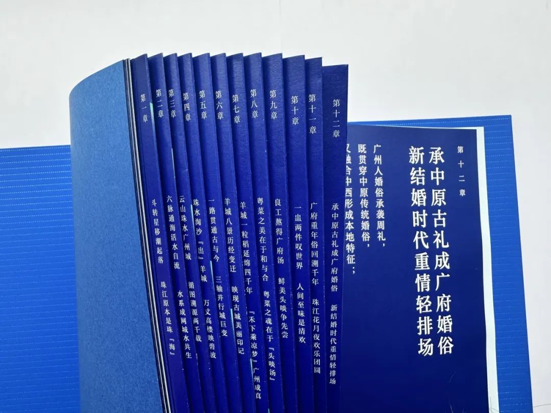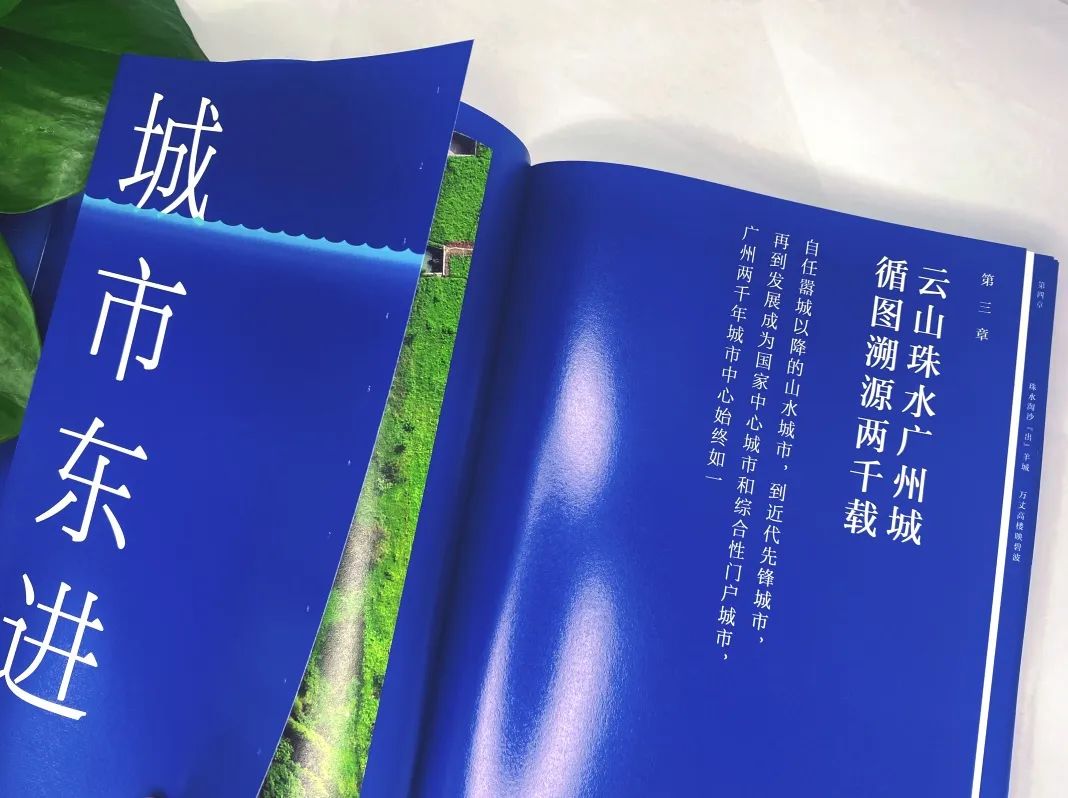 图书的装帧设计重在体现广州城从“沧海”到“粮田”的蝶变,波纹图形从目录延续到章节,是水也是山,连绵不绝。十二个章题拉页通过折叠结构,凸出于书口的平面,寓意广州“敢为天下先”的气魄。