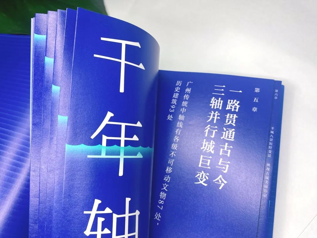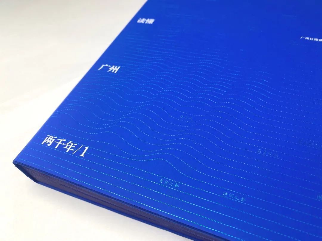 护封跳动的线条烫印出亮蓝色“广州”的变体文字,是广州云山珠水的写照,也体现广州璀璨跳动的城市活力。二十余个“广州”历代更迭的名称,在封面和目录页排布,展现广州厚重的城市故事与记忆。