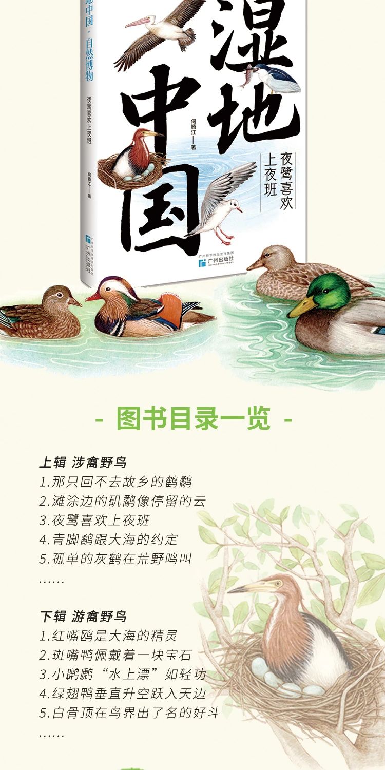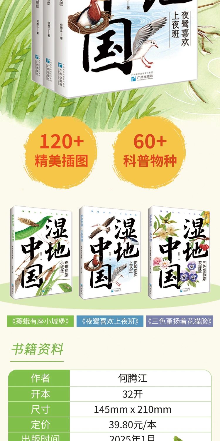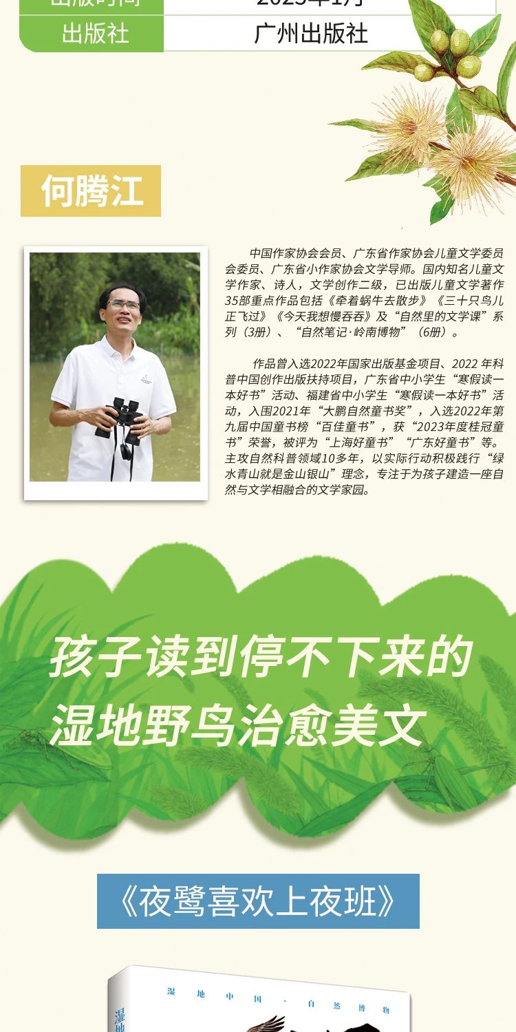 “湿地中国·自然博物”系列入选广州市文艺精品项目,收录了作家何腾江全新创作的湿地文章共60篇,分别呈现了湿地野鸟、湿地昆虫、湿地植物等内容。